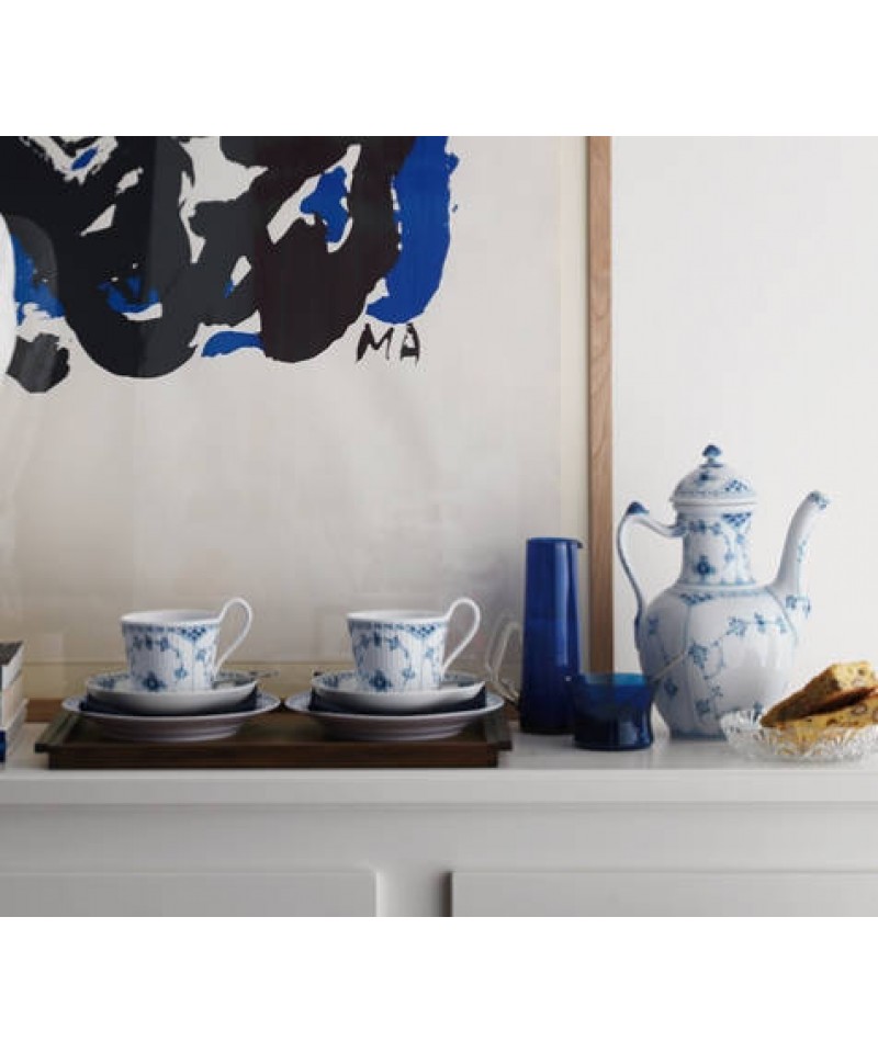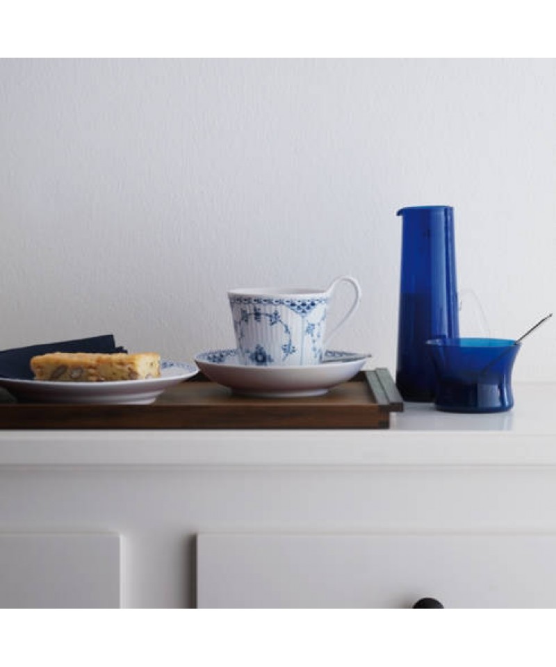 The largest of two high handle cups in the pattern of Blue Fluted Half Lace, this High Handle Cup and Saucer contains 24 cl of your favourite tea or coffee. The cup is decorated by hand with a charming pattern of blue flowers and palmettos, adding a touch of classic elegance to any coffee or tea moment. Blue Fluted Half Lace is adorned with delicate lace, elegantly framing the hand-painted motif and charming details of the collection such as snail shells on lids and handles.