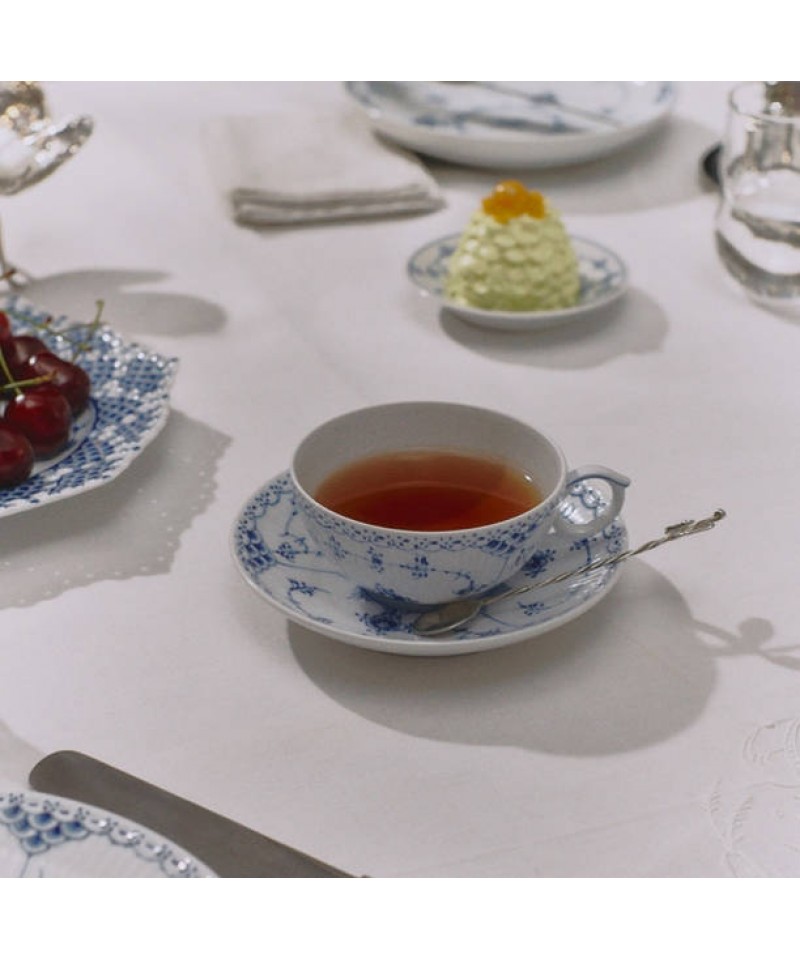 The timeless style of this Blue Fluted Half Lace 20 cl Cup and saucer adds a touch of classic elegance to any table. The hand painted pattern adorns the classic teacup shape, which lets the tea cool down to a fitting temperature making every sip enjoyable. Blue Fluted Half Lace is adorned with delicate lace, elegantly framing the hand-painted motif and charming details of the collection such as snail shells on lids and handles.
